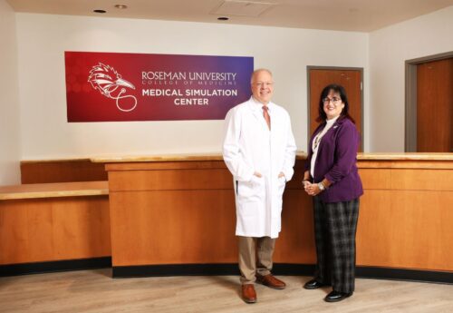 The Simulation Center is a 12,000-square-foot facility at Roseman University College of Medicine. It features patient rooms for standardized patient encounters, clinical skills rooms, and high-fidelity immersive simulation rooms, providing medical students with practical learning experiences that support their growth throughout all four years of education.